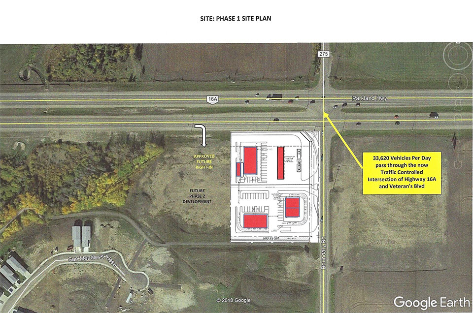 Stony Plain, Alberta — Phase I Completed 2021 Retail/gas bar fast food site:Circle K/EssoA&WPerks CoffeePizza 73Econo Liquor Corner of Highway 16 A and Veteran’s way stony_plain_site_plan_with_road_implications Image 5 of 6
